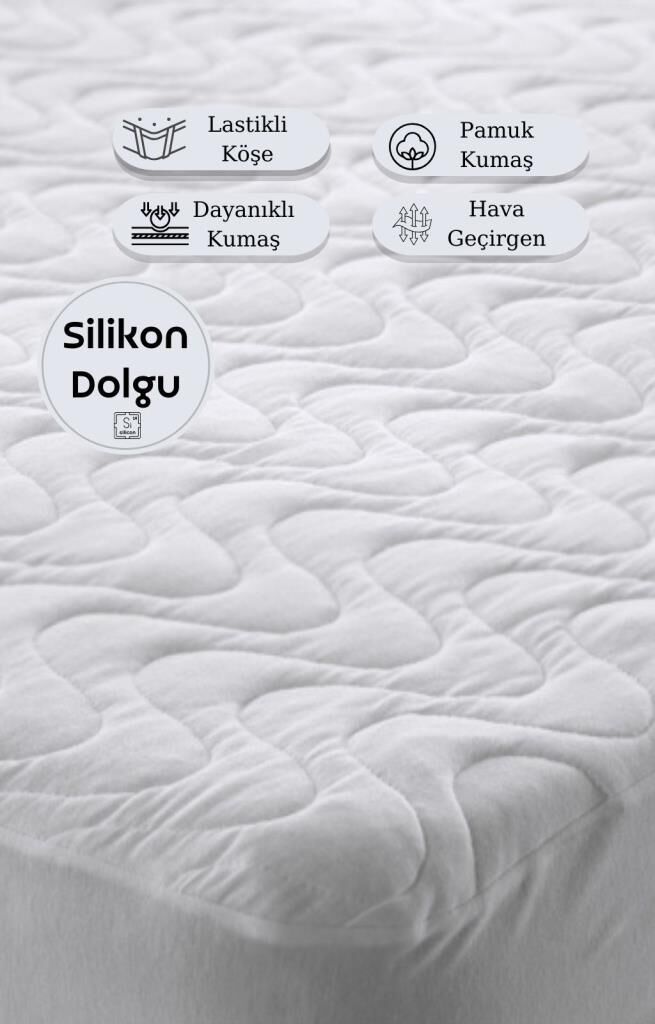 Kapitoneli Yatak Alezi: Ürün 4 kenarı (Fitted) lastikli olup, üst kumaş %100 pamuk, iç dolgu silikondan imal edilmiştir.