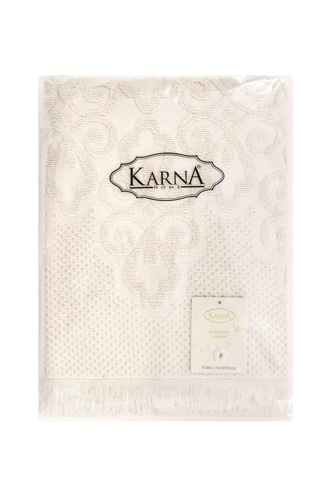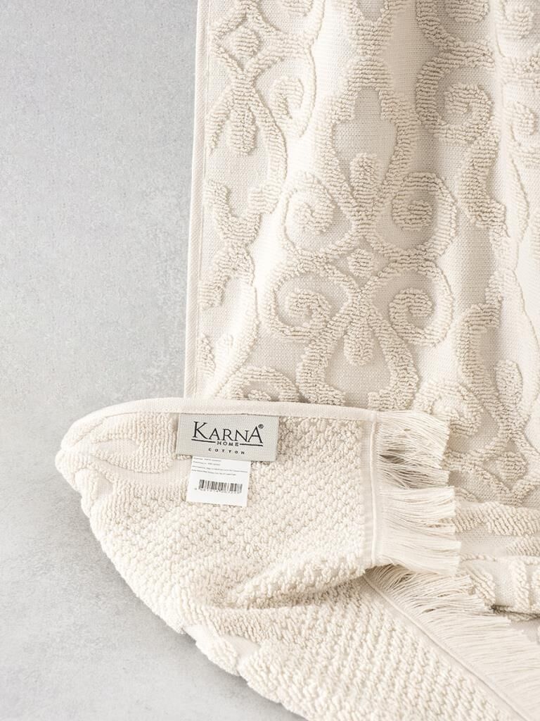 Neroli jakarlı pamuk havlu, geniş ölçüsü ve üstün emiciliğiyle banyoda lüksü ve konforu hissettirir.
