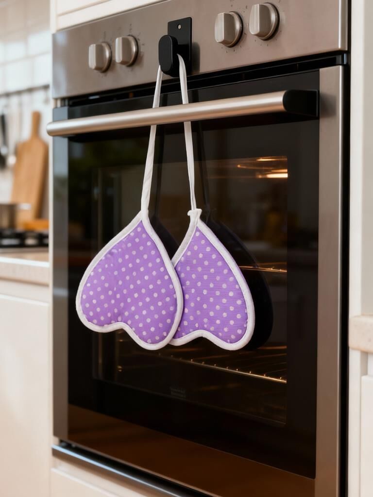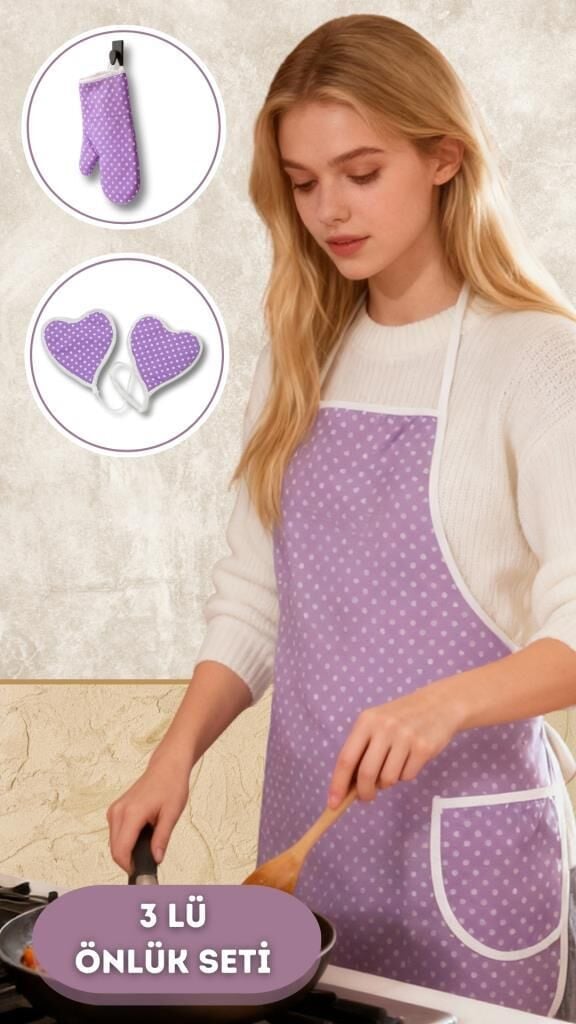 Puantiyeli Mutfak Seti 3’lü – Su Geçirmez Isıya Dayanıklı Önlük + Eldiven + Tutacak Lila - 50 X 70