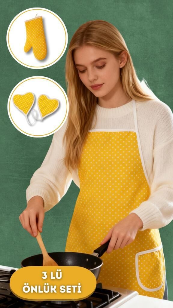 Puantiyeli Mutfak Seti 3’lü – Su Geçirmez Isıya Dayanıklı Önlük + Eldiven + Tutacak Sarı - 50 X 70