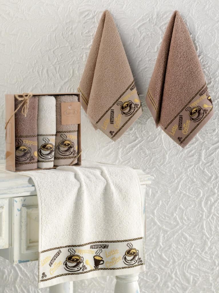 Mutfak Havlu Seti 3’lü Jakarlı Pamuk Coffee Cup 30x50 Sütlü Kahve - 30 X 50