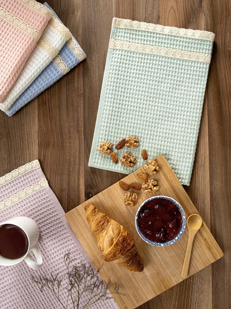 Her bir havlu, kenarındaki zarif güpür detayıyla klasik mutfak havlularından ayrılır ve mutfağınıza lüks bir dokunuş getirir. Özel olarak seçilmiş renkleri sayesinde set içerisindeki tüm havlular birbirini tamamlar, uyumlu bir görünüm oluşturur.