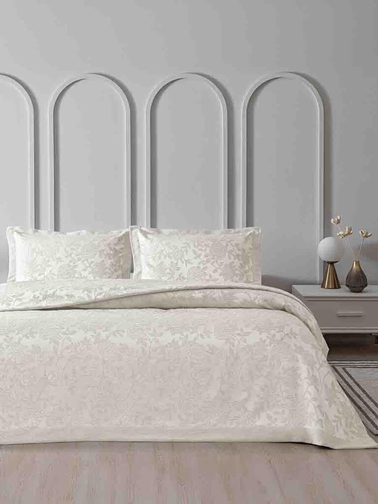 Yatak odanızda konfor ve şıklığı bir arada yaşamak için tasarlanan Estela Jakarlı Yatak Örtüsü, modern ve zarif dokusuyla öne çıkıyor.